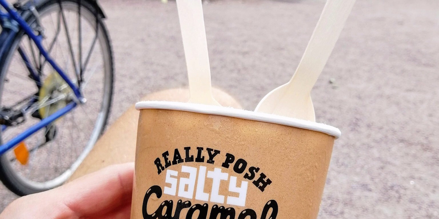 Omat kokemuksemme maidottomista jäätelöistä ovat melko olemattomat, ehkä jopa hieman ennakkoluuloiset; kaupasta näitä ei nimittäin ole kotiin kannettu. Siispä suurella uteliaisuudella etsimään paikka puistopenkiltä ja maistamaan suolakinuski-hasselpähkinä-hässäkkää, Really Posh Salty Caramel Hazelnut -jädeä.
