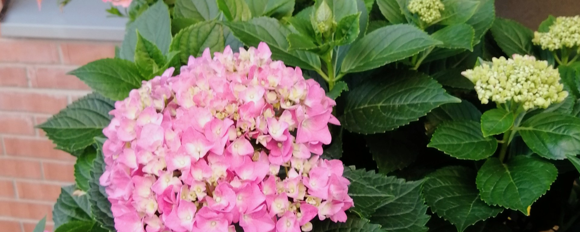 Istutimme sen isohkoon ruukkuun ja olemme kastelleet ja lannoittaneet sitä läpi kesän. Sen alkuperäiset kukinnot olivat sinisiä (ehdoton suosikkivärini), mutta ne aika nopeasti kuihtuvat pois (kenties ruukku oli päässyt kuivumaan myymälässä). Puoliso uskalsi reilulla kädellä karsia tainta leikaten pois liki kaikki kukinnot. Pitkään se olikin vain vihreä pensas, mutta kesän mittaan siitä on kasvanut iso, ja yllätys oli mukava, kun se teki melkein joka latvaan uudet nuput, joista ensimmäiset ovat jo täydessä kukassa – vaaleanpunaisina!