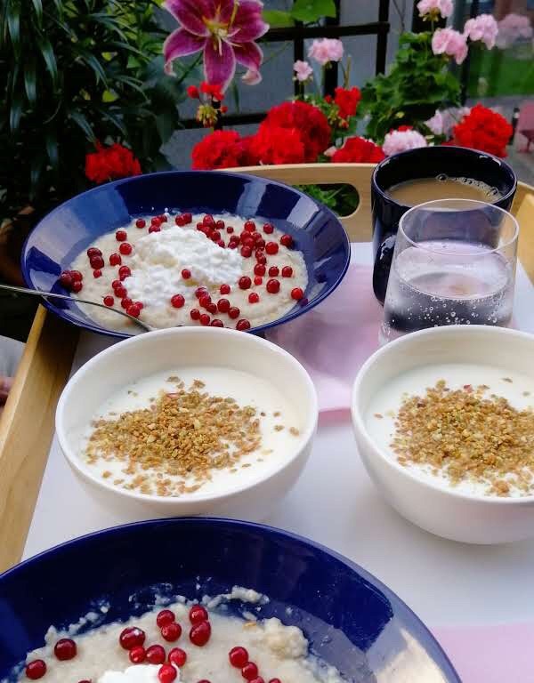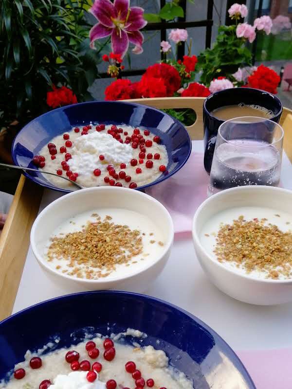 Arkiaamujen tapa on keittää kaurapuuro. Puuroannokseen tulee raejuustoa sekä marjoja, tuoreita, jos niitä on saatavilla, mutta yleensä kaivamme pakastimesta puolukoita, mustikoita tai herukoita maustamaan puuroa. Kahvi on liki poikkeuksetta tummapaahtoista ja mm. Löfberg’s Lilan eri variantit ovat suosikkejamme. Lisäksi yleensä tarjolla on maustamatonta jogurttia pähkinä-siemenrouheella ja usein myös kotikeittoisella hillolla. Tällä setillä pärjää hyvin lounaaseen saakka.