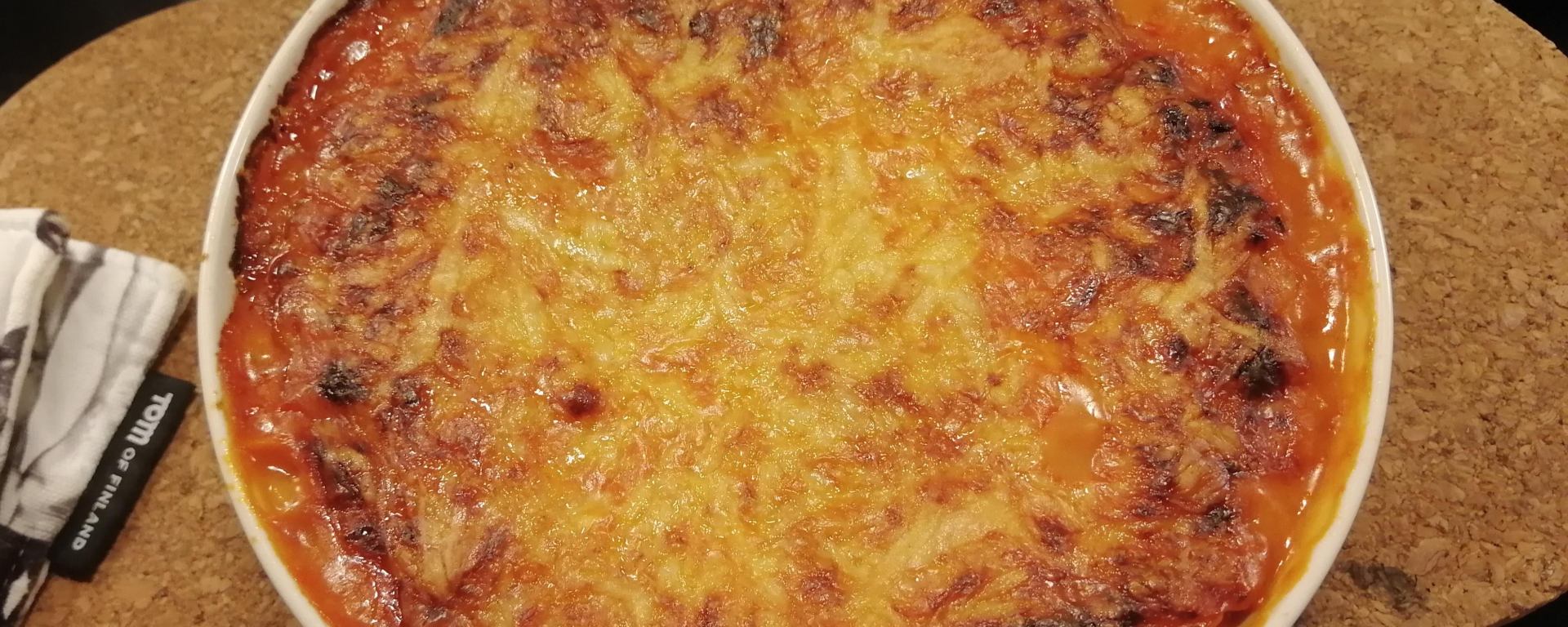 Itse sekoitan ainekset isossa muovikulhossa ja kaadan siitä vuokaan. Sekoituksen voi toki tehdä vuoassa, niin on vähemmän tiskattavaa. Viimeiseksi ripottele päälle juustoraastetta maun mukaan, itse laitan sellaiset pari desiä. Sitten vuoka uuniin ja valmista pitäisi olla 45 minuutin päästä. Joskus menee vähän enemmän, kun haluan juustokuorrutteen saavan hyvän värin.