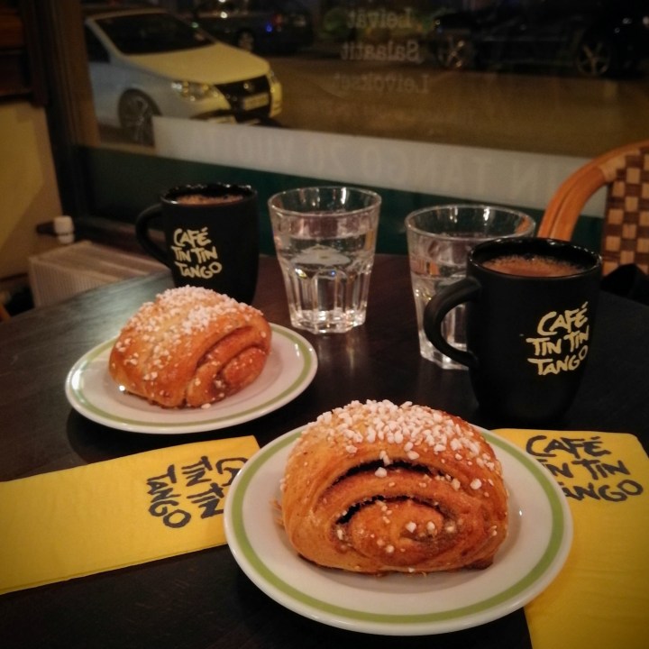 Päivän päätteeksi tehtiin vielä iltakävely Töölöntörille Café Tin Tin Tangoon. Mukavassa viileässä illassa kahvihammasta alkoikin sopivasti kolottaa ja tuoksuvat korvapuustit saivat veden kielelle.