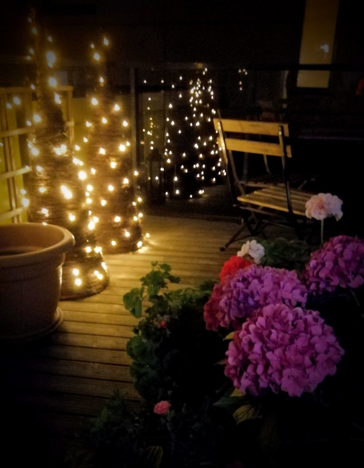Ja kuin varkain ovat illat jo alkaneet pimetä ja valoa alkaa kaivata. Muun puurtamisen lomassa haettiin kellarista kesätauolle viedyt ulkovalot ylös ja asennettiin ne hauskoihin pajukartioihin. Illan tullen niistä tulikin mitä mukavin tunnelman luoja parvekkeelle, eikö vain?