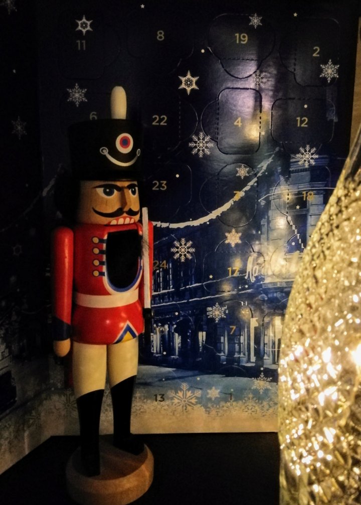 Joulukalenteria vartioi rakas matkamuistoni, punanuttuinen Pähkinänsärkijä Kölnin joulumarkkinoilta vuodelta 2004. Tuon syksyn asuin Brysselissä ja sieltä käsin oli helppoa matkustaa lähialueille. Pähkinänsärkijä asuu pääosan vuodesta silkkipaperiin käärittynä kaapissa, mutta joulun tullessa Hän saa kunniapaikan seurata elämäämme.
