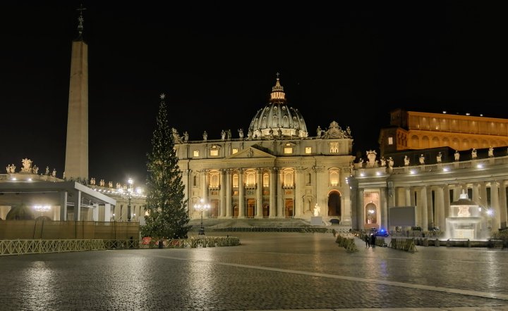 Mutta mutta… Kello tikittää liki iltayhtätoista eikä täällä kyllä niin hirveästi tungosta ole. Niin no, emmehän virallisesti Roomassa ollakaan, jos pilkuntarkkoja ollaan. Kuvan hetki on vangittu Pietarinkirkon aukiolla, maailman pienimmässä valtiossa, Vatikaanissa. Täällä on jo joulukuusi paikoillaan ja seimiasetelmaa vielä rakennetaan. Ehkä ihmiset odottavat täälläkin joulukuusen valojen syttymistä ja seimiasetelman valmistumista..