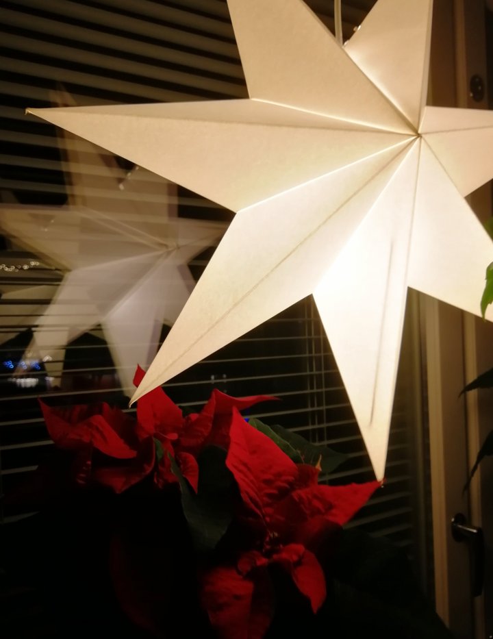 Koristeita, kukkia, valoja. Jokaisella on omat suosikkinsa jouluun. Ikkunalaudalla on kynttelikkö, tuikut loistavat kyntteliköissä ja jo useamman vuoden on omassa ikkunassa roikkunut valkoinen tähti, jonka sisällä loistaa valo. Tuo tähti tähdistä kirkkain riittää luomaan mukavasti tunnelmaa illan hämärään ja näkyy ulos saakka naapureiden ja ohikulkijoiden iloksi.