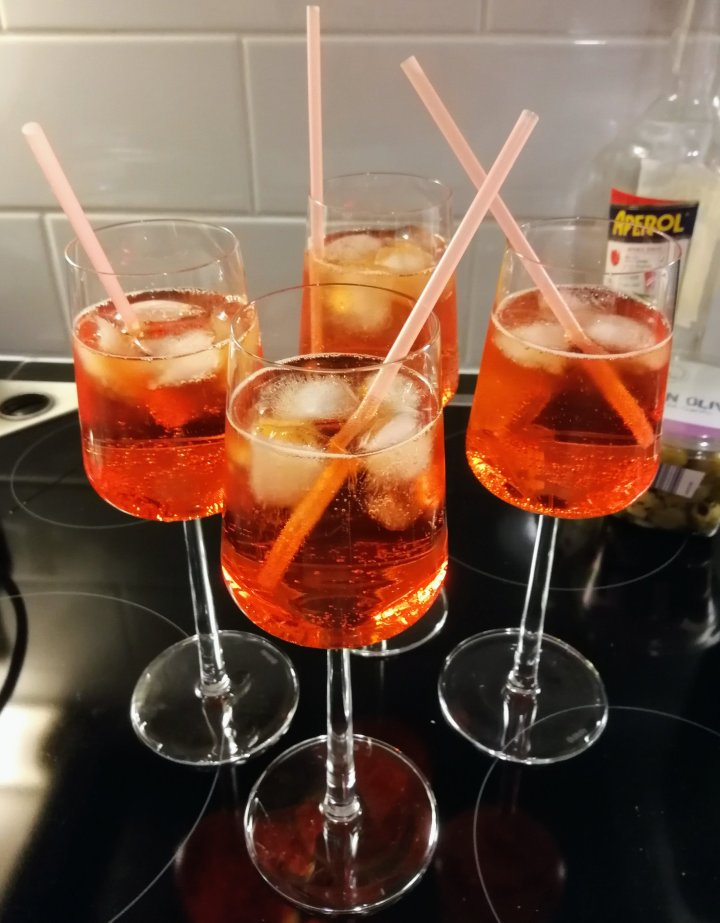 Alkumaljoiksi valitsimme glögin sijasta epätodellisen väriset Aperol Spritzit. Italian Veneton maakunnasta lähtöisin olevat aperitiivit löytyvät nykyään myös Helsingin katukuvasta kesäisin.