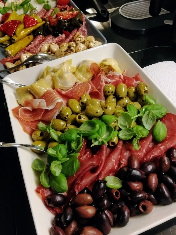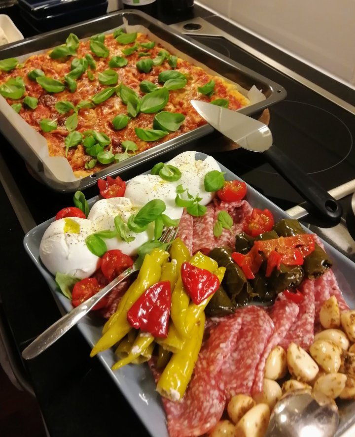 Aperitiivien perään sitten samalla alkuruoaksi kuin pääruoaksikin oli erilaisia antipastoja: parmankinkkua, bresaolaa ja Milanon salamia, puhvelimozzarellaa ja gorgonzolaa, oliiveja, artisokansydämiä, tuorejuustotäytteisiä paprikoita, viininlehtikääryleitä jne. Lisäksi T paistoi suussasulavan herkullista Margherita-pizzaa.