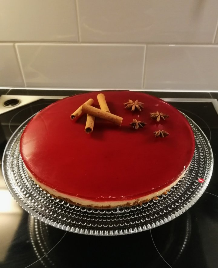 Pikkujoulujen jälkiruoka oli sitten se työläin ja useampivaiheinen. Italia-teemaan olisi sopinut tiramisu, mutta sitä tehtiin samalle vierasparille jo heidän edelliselle visiitille, niin nyt päädyin tekemään yhden joulun kestosuosikeista, mausteisen juustokakun glögikiilteellä. Ohjeen löydät K-ruoan reseptisivulta.