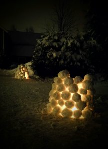 Lumileikit ovat hauskaa puuhaa aikuisillekin. Täytyy vielä tunnustaa että taidot olivat vuosien varrella hieman ruostuneet ja nämä kaksi lyhtyä jouduttiin kokoamaan useamman kerran uudelleen ennen tyydyttävää lopputulosta.