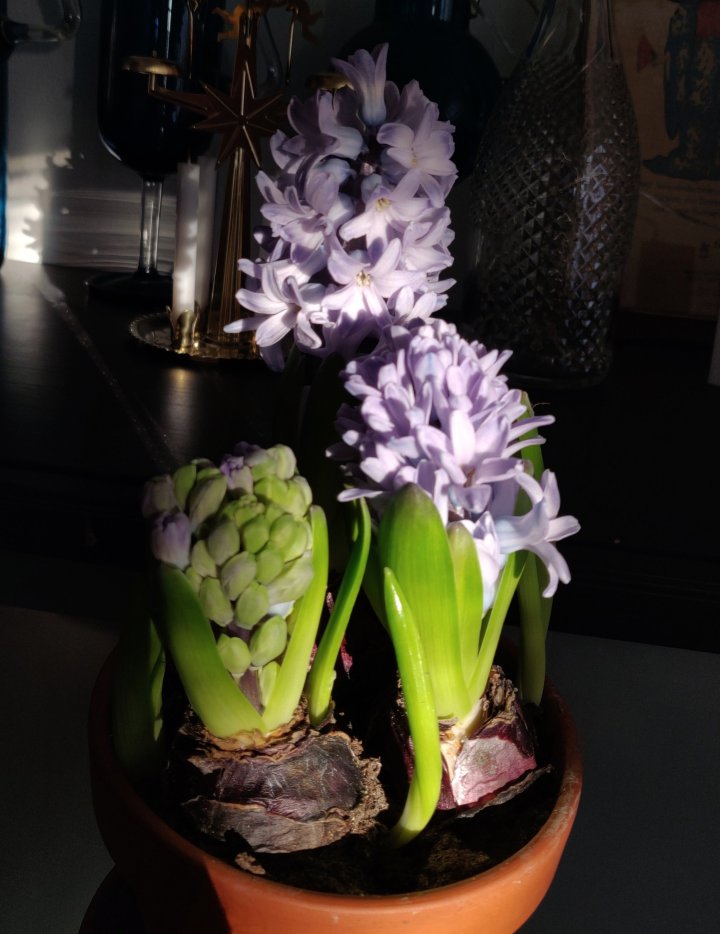 Joulun tuntua on muutenkin meillä kotona yhä. Syksyllä istutetut sipulikukat eivät ihan ehtineet jouluksi kukkaan, mutta upeat vaaleansiniset hyasintit edelleen levittävät huumaavaa tuoksuaan ympäri asuntoa.