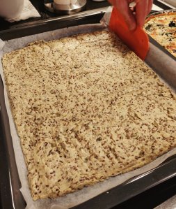 - Levitä taikina leivinpaperin päälle uunipellille tasaiseksi ja ohueksi