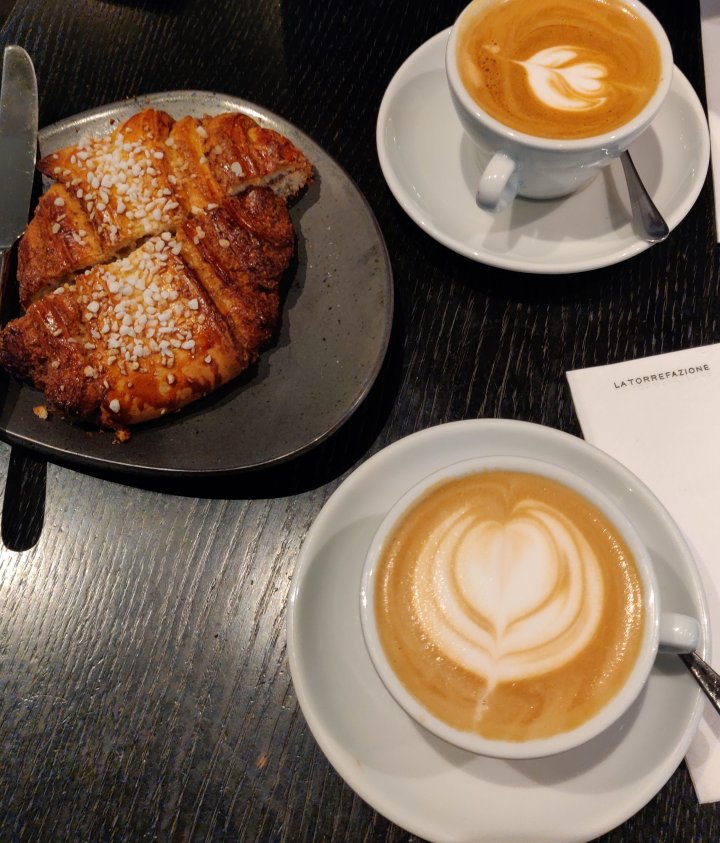 Tänään treffasimme töiden päätteeksi samaisen kukkakaupan edessä, mutta jätimme kävelyn sikseen, koska liukkailla kaduilla oli loskaa ja vettä nilkkoihin saakka. Menimme suoraan kahville Kluuvin Fratelloon. Samat juomat, mutta tällä kertaa jaoimme korvapuustin. ”Sharing is caring” 😉