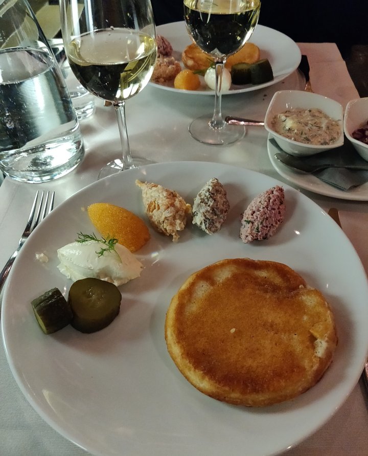 Alkuun heti tilattiin nimellistä lisämaksua vastaan toinenkin blini, kun näytti, että yksi ei voisi mitenkään riittää ja täytteitäkin oli runsaasti. Niinpä niin. Olihan siinä lopulta aika paljon syömistä, emmekä sitten jaksaneetkaan jälkiruokaa enää.