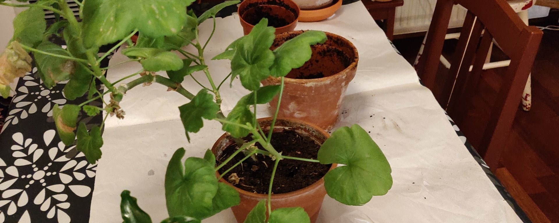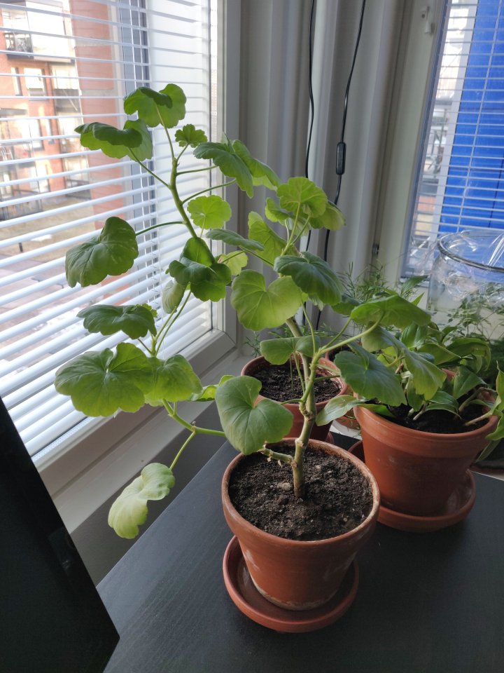 Valon puute ja tuo nykyajan vitsaus, keskuslämmitys, tekevät olosuhteet tukalaksi monelle kasville. Tänä talvena varauduimme pimeään hankkimalla Airamin kasveille tarkoitettuja ledilamppuja, jotka ripustimme verhokiskoon Nelson Gardenin valaisinjohdolla. Viritelmä on varsin onnistunut. Ja kasvit ovatkin saaneet valoa ja jopa kasvaneet. Viime kesänä parvekkeella kasvaneesta pelargoniasta katkesi oksa. Juurrutin sen lasissa ja istutin ruukkuun, ja osittaiseksi yllätykseksi se on viihtynyt hyvin sisällä koko talven.