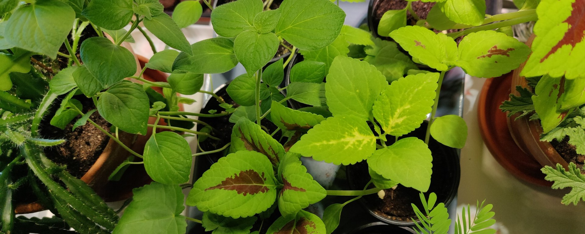 Nuo kasvoivat nopeasti sen verran suuriksi kasvihuoneessa, että istutin ne muutama viikko takaperin pieniin omiin ruukkuihin ja nyt tilanne se, että pitäisi taas istuttaa ne isompiin ruukkuihin, kun osassa juuret puskevat pohjarei’istä läpi. Osasta katkaisin jo latvoja juurtumaan vesilasiin, ja niistä sitten saa taas uusia kasveja.