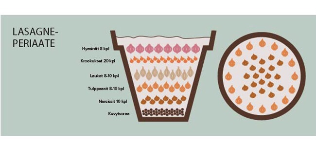 Netin syövereissä tuli vastaan termi ”bulb lasagna”, sananmukaisesti käännettynä siis kutakuinkin voisi puhua kukkasipulilasagnesta. Siinä sipulit istutetaan ruukkuun kerroksittain toistensa päälle ”lomittain”. Tuosta istutusmetodista kerrotaan suomeksi mm. Plantagenin sivulla. Alla on kuva samalta sivulta, jossa näkyy hyvin idea.