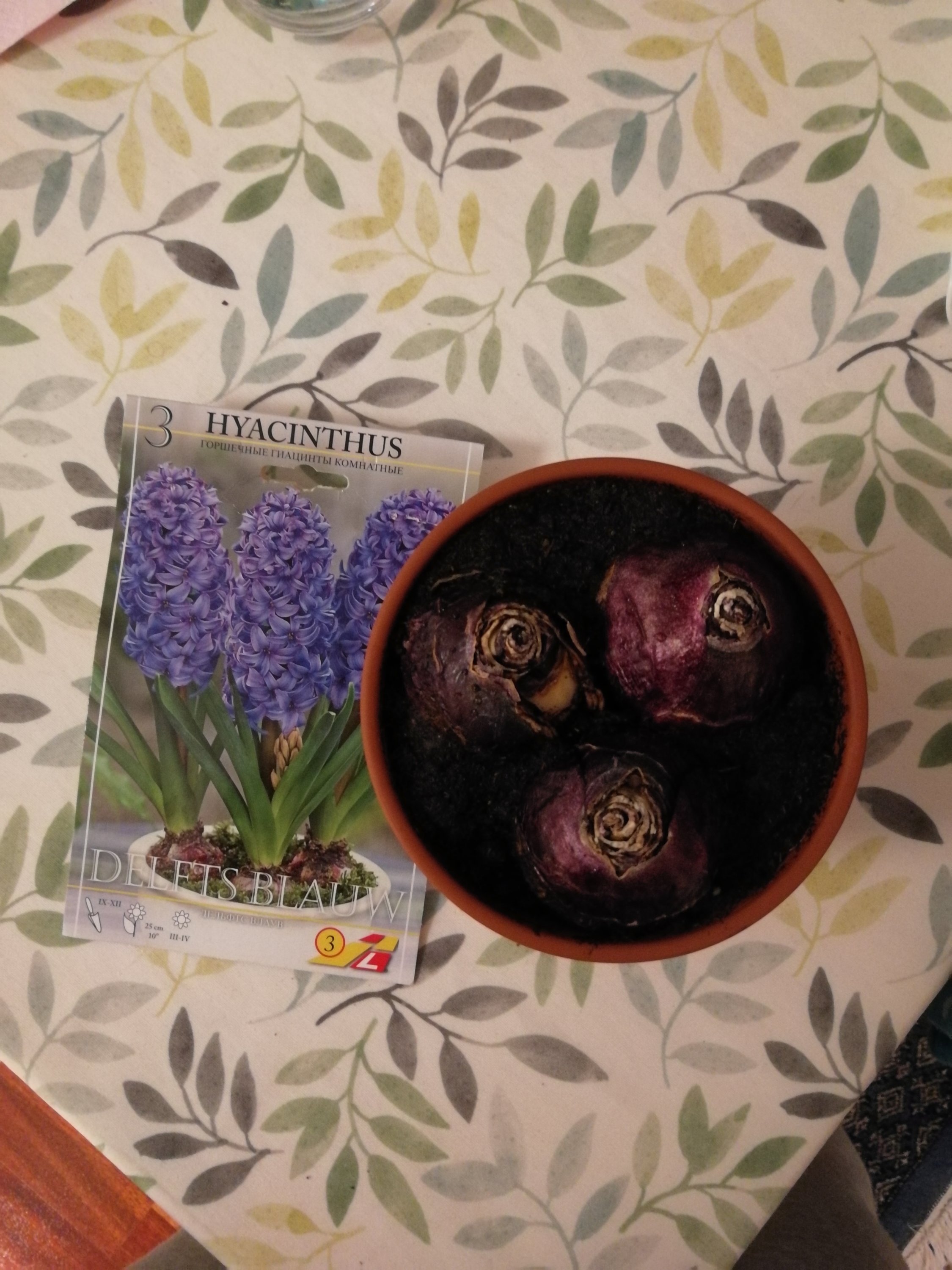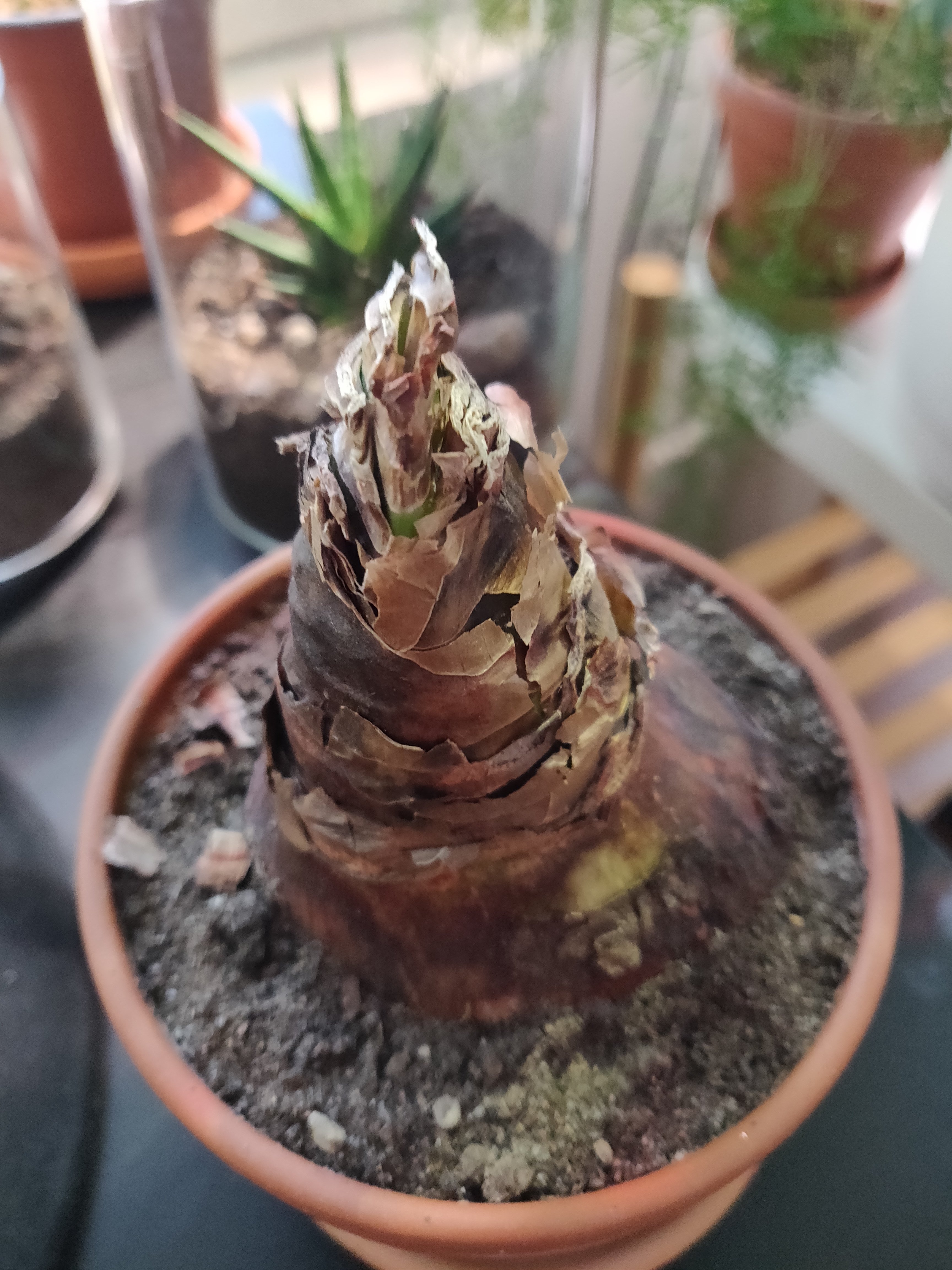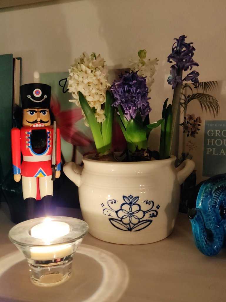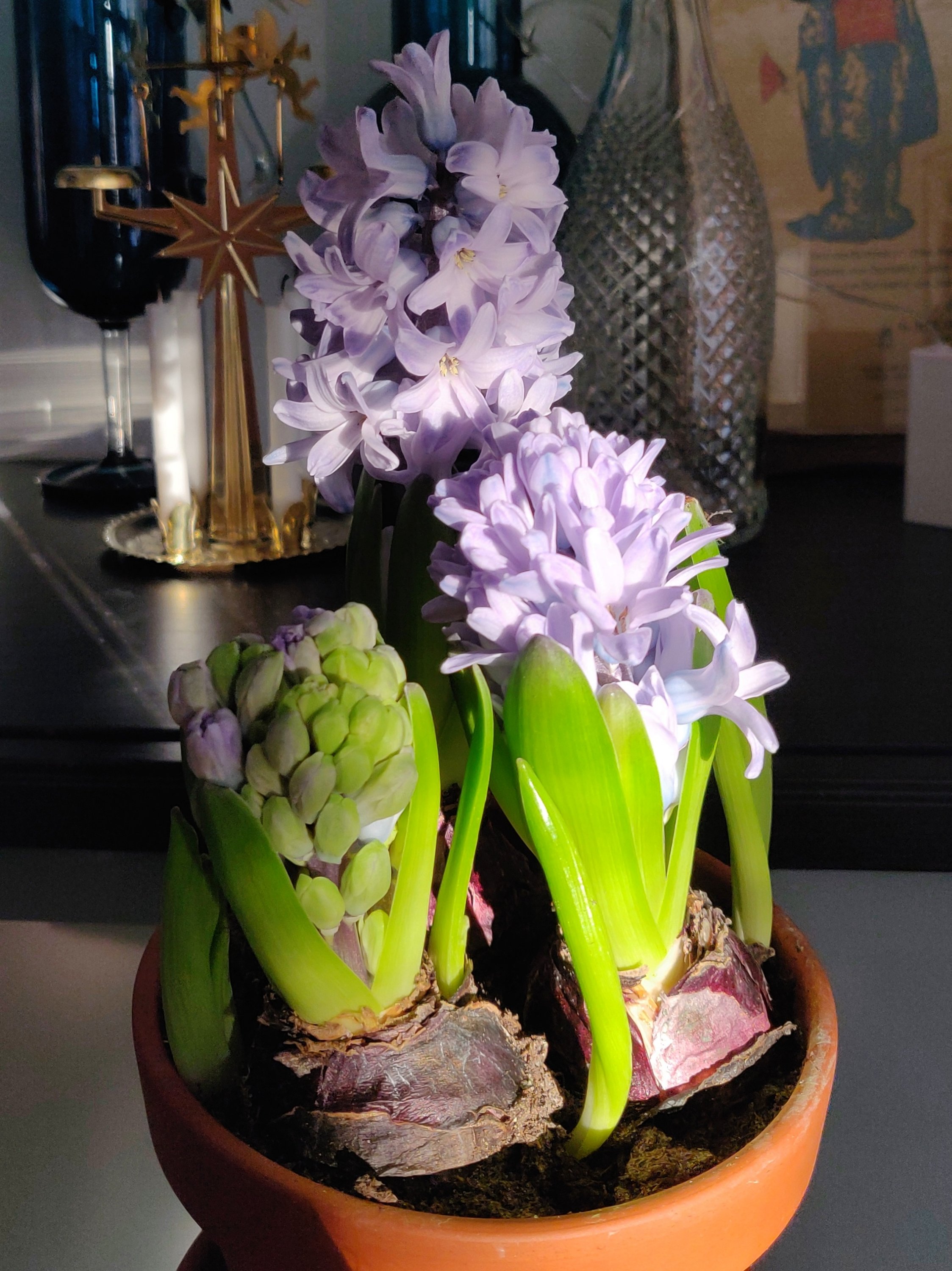 Pari vuotta sitten kokeiltiin käsiteltyjen hyasinttien kasvatusta sekä amarylliksen kukittamista ostamalla niiden sipuleita. Kolme upeaa Delft Blue -hyasinttia olivat ensin parvekkeella styroxboksissa saamassa tarpeellista kylmäkäsittelyä, mutta ruukut jäätyivät (niin ei ohjeen mukaan saisi käydä). Laitettiin ruukku sitten jääkaappiin, jossa mullan pintaan puolestaan kasvoi hometta. Jo oltiin heittämässä hyasintteja roskiin, kun sipuleista alkoi näkyä elon merkkejä ja sitten yks kaks yllättäen ne alkoivat versoa. Kukinnan huippu sattui vuodenvaihteen aikaan. Delftin kaupunki Hollannissa on tunnettu sinivalkoisesta posliinistaan, joten näissä hyasinteissa ilmennyt hailakka vaaleansininen oli hivenen pettymys. Ainakin niissä posliineissa sininen väri yleensä on tummempaa ☺️