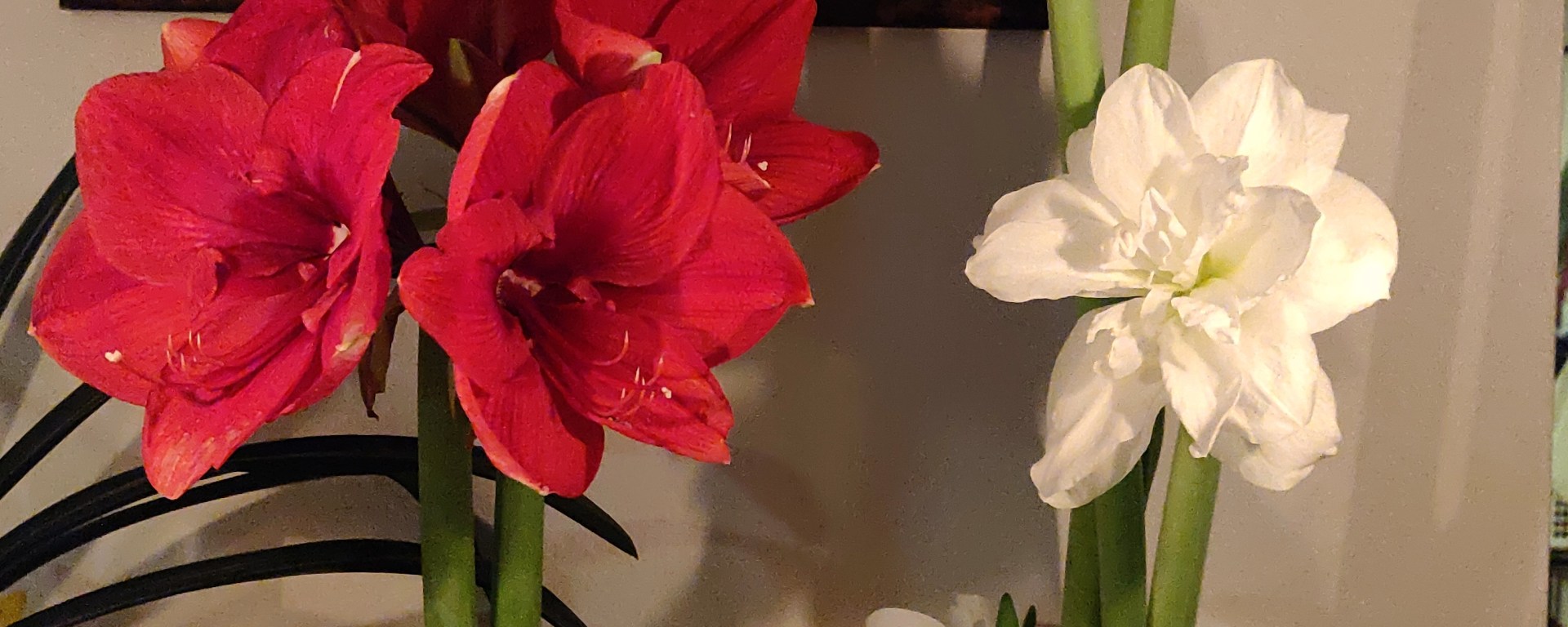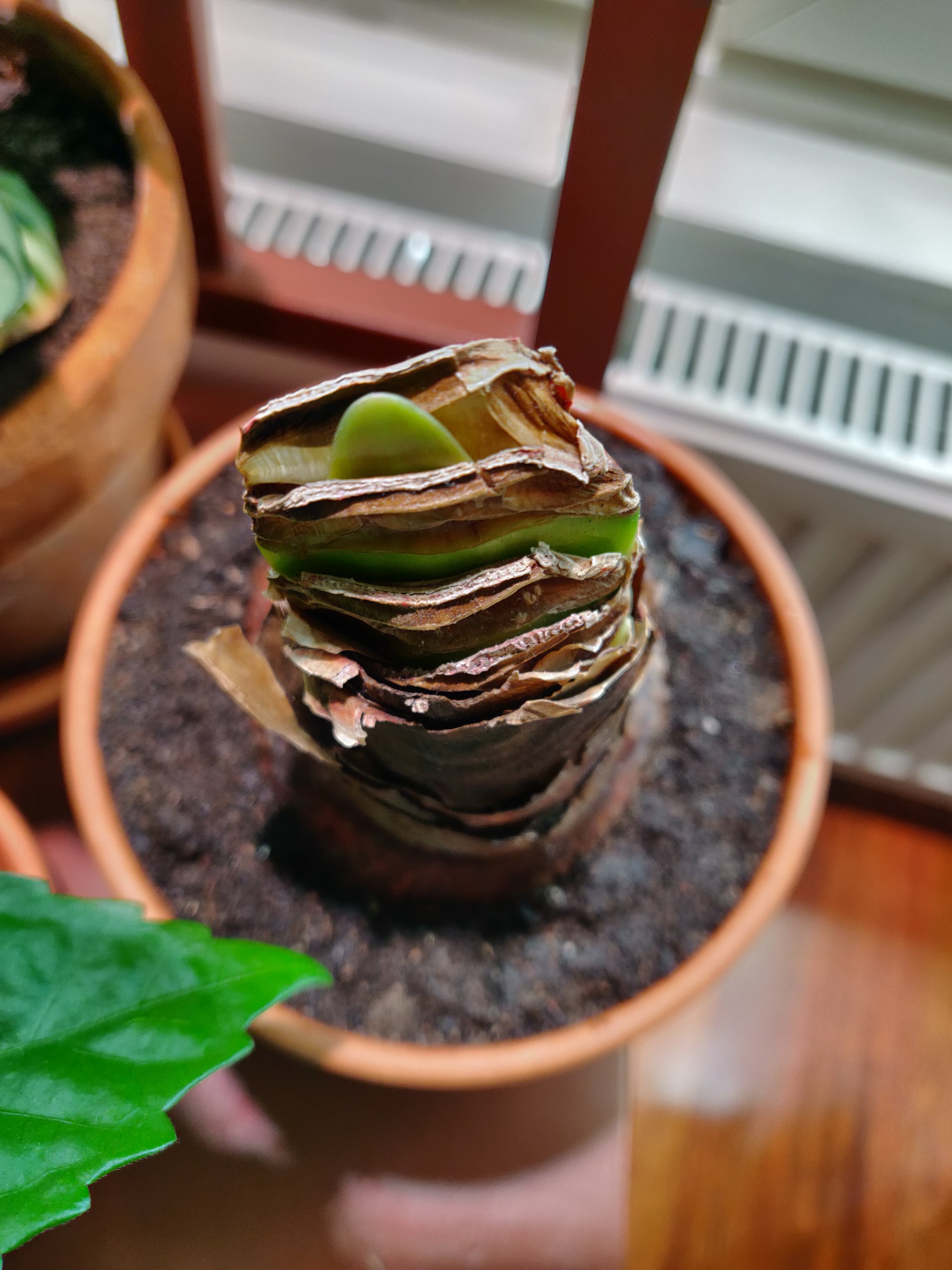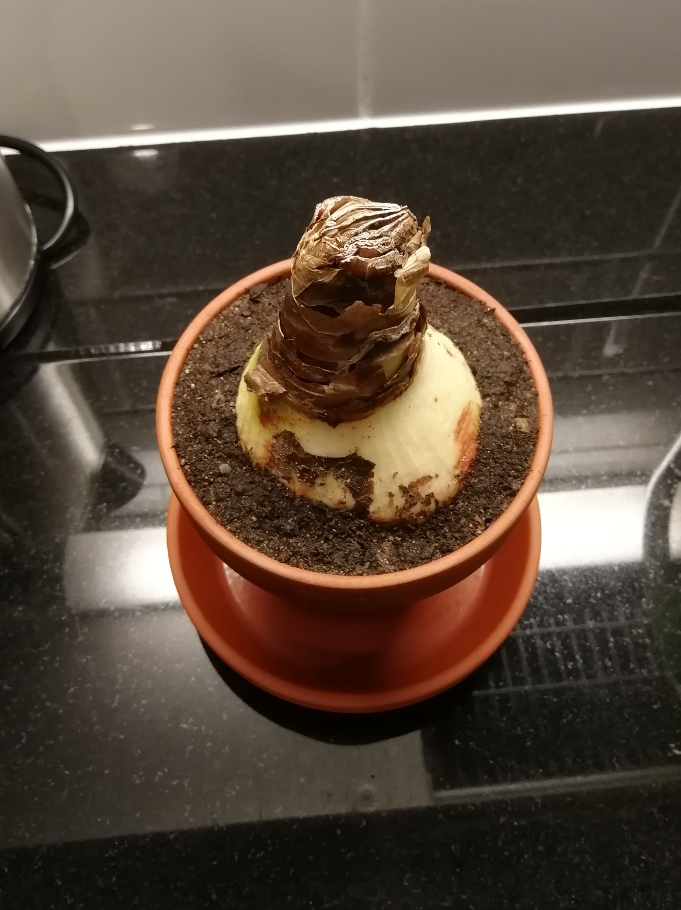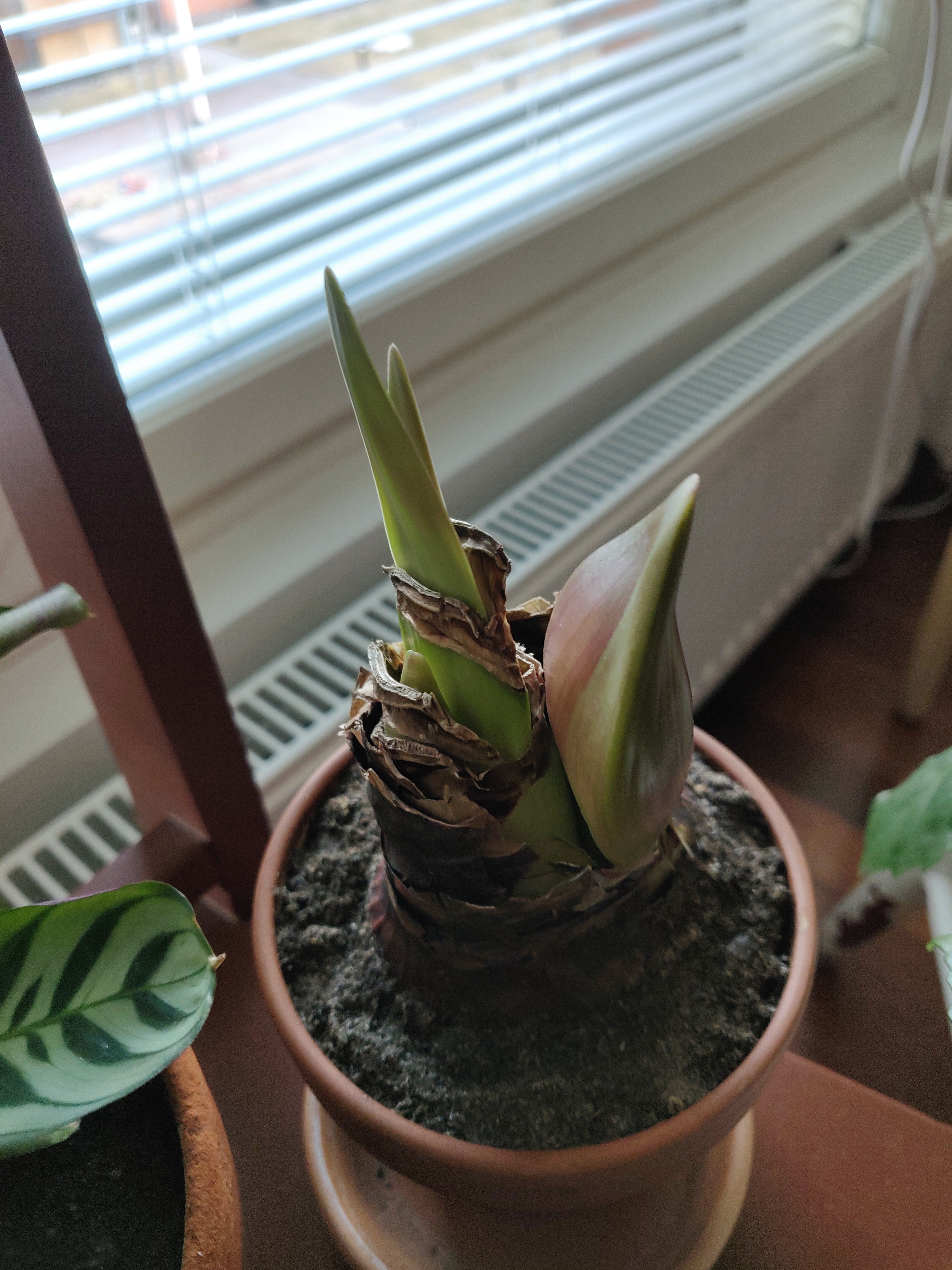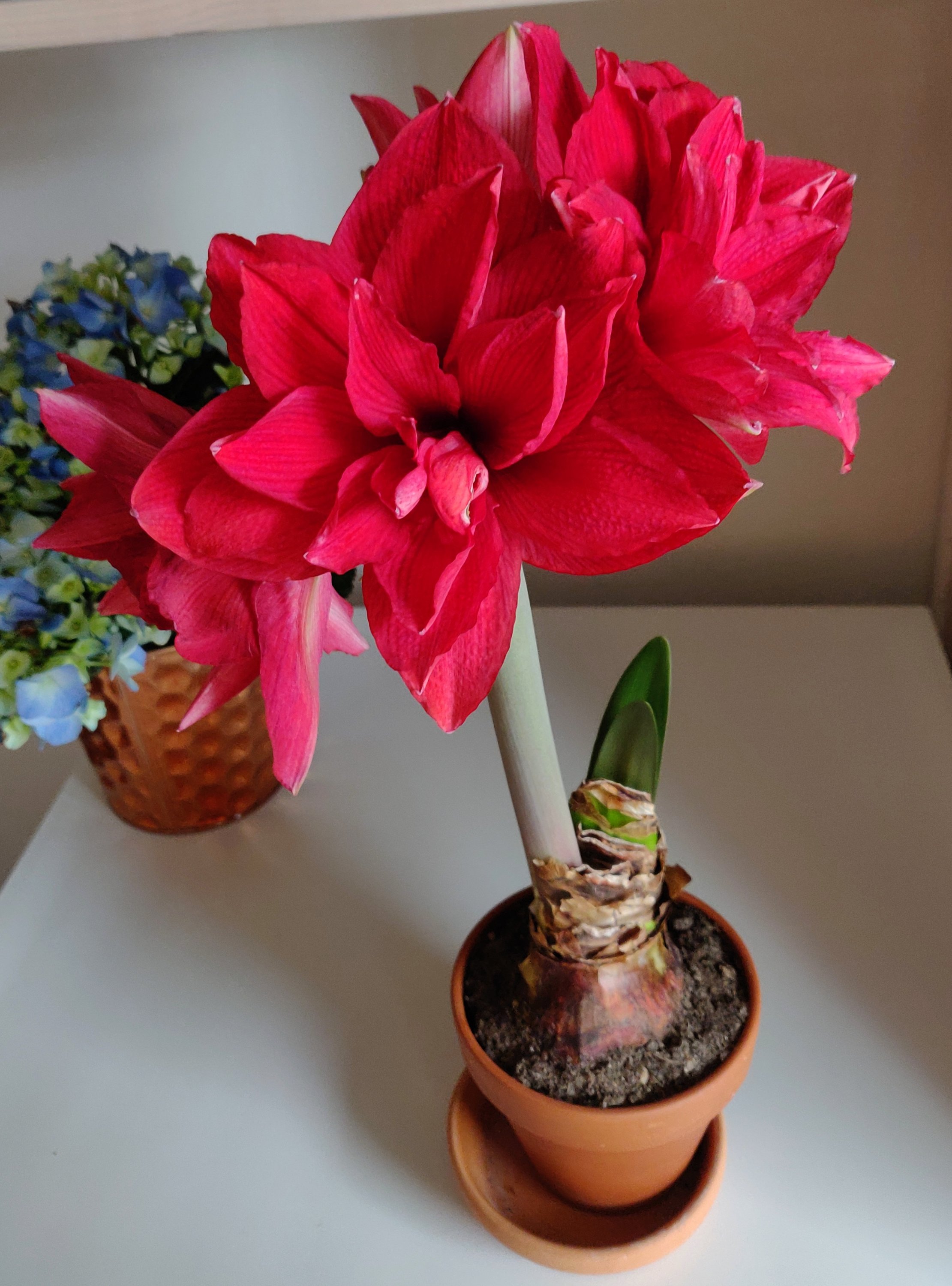Kokeiltiin myös jaloritarinkukkaa eli amaryllistä. Vuorokauden kylpy vesiastiassa juurille ennen istutusta ja sipulin istutus riittävän pinnalle. Sitten vaan odottamaan kukintaa. Amarylliksen pitäisi olla hyasintteja helpompi, kun se ei kaipaa tässä vaiheessa enää kylmäkäsittelyä. Jouluksi tämä sipuli ei kuitenkaan kasvattanut kukkavartta, ei mitään muutakaan. Helmikuussa tilanne näytti yhä epätoivoiselta. Mutta vähän vihreää siinä edelleen oli. Kukka unohtui ikkunalaudalle ja kuinka ollakaan: kuukautta myöhemmin sieltä pilkisti lehden alku! Sitten myös alkoi kasvupyrähdys ja kolme viikkoa myöhemmin oli upeat valtavat punaiset kukat avautuneet.