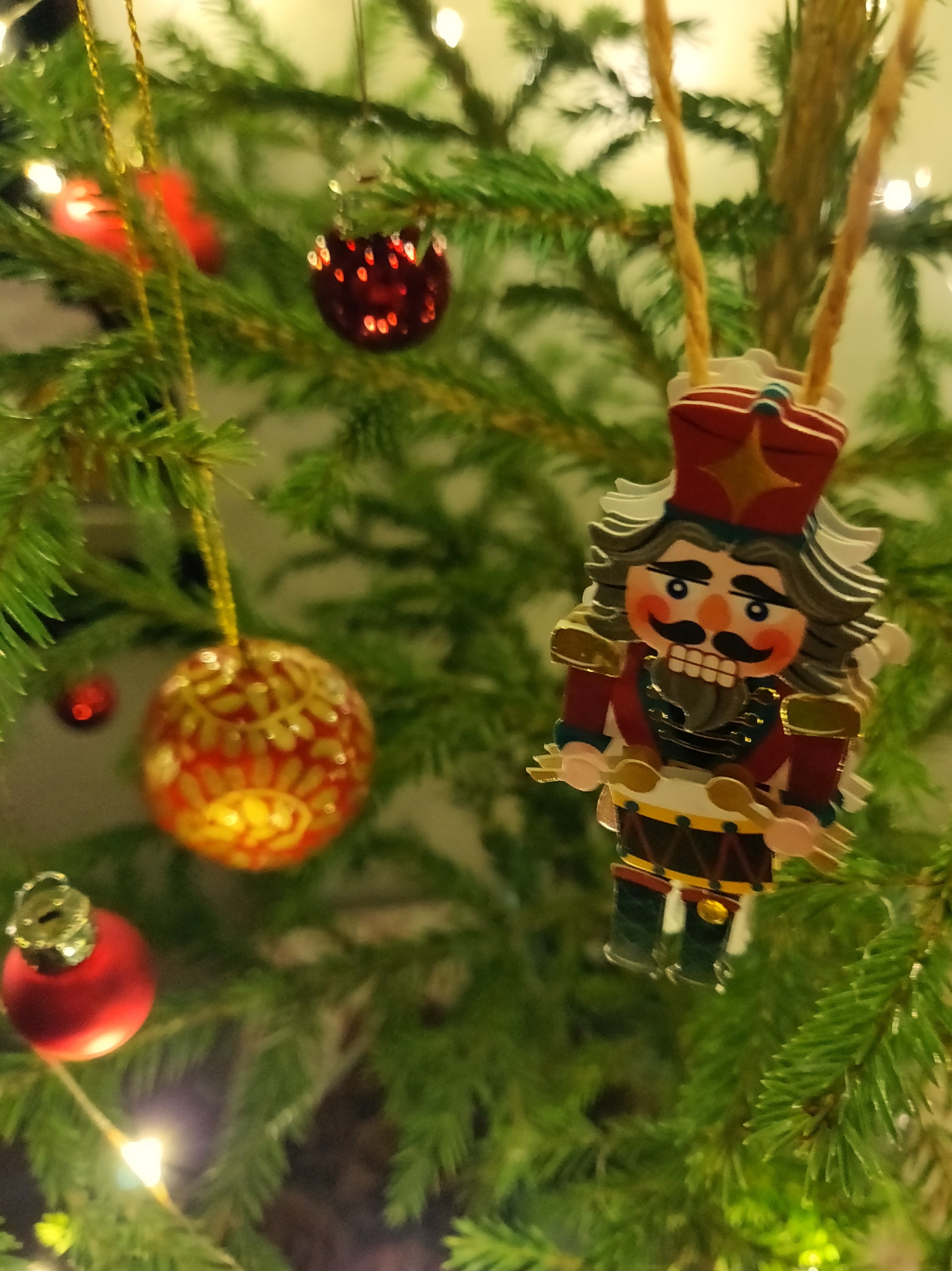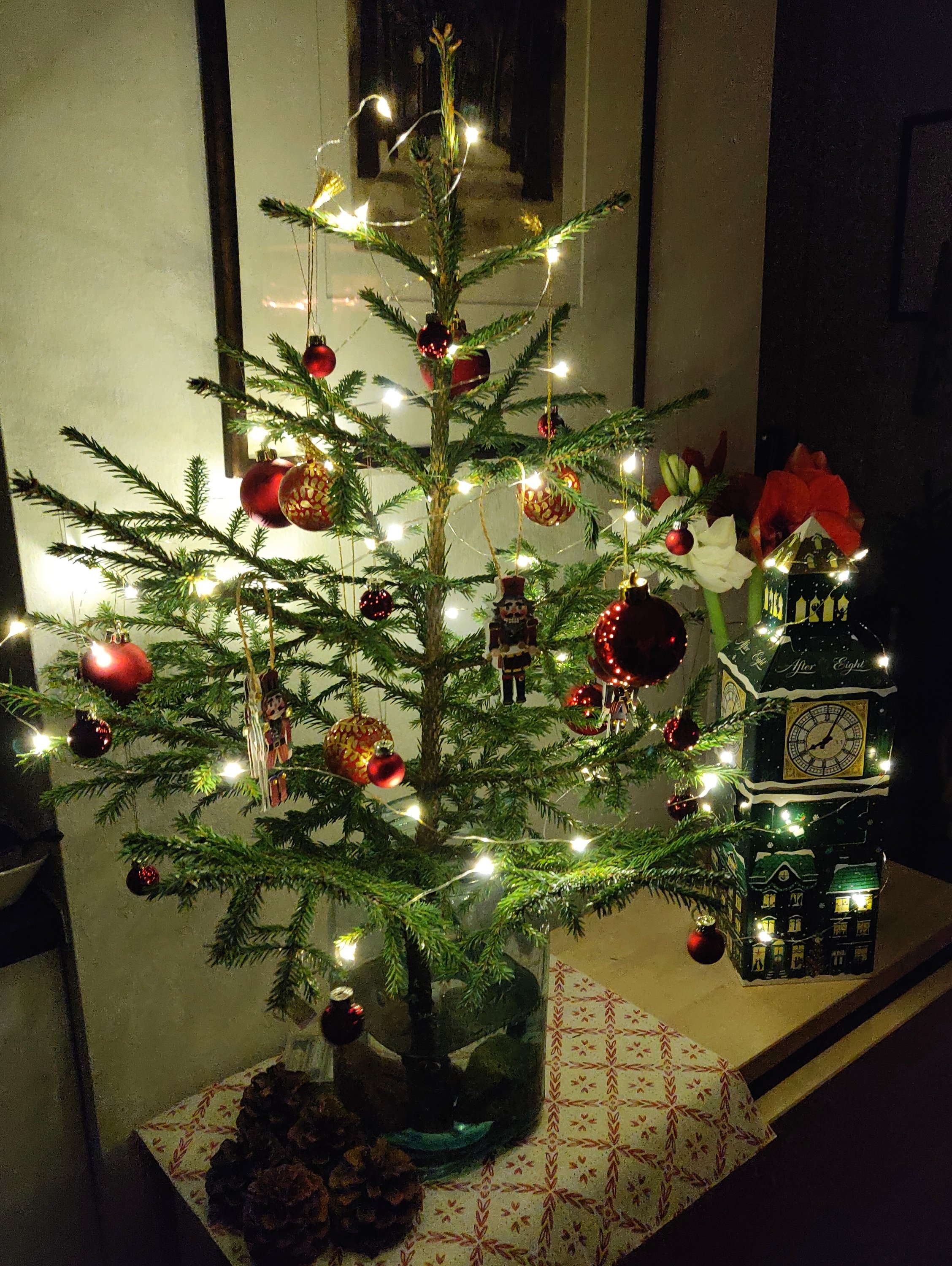 Perinteinen joulukuusi jäi tällä kertaa hankkimatta, mutta pöydälle vanhaan Riihimäen lasin tölkkiin löytyi eteläisen Savon sydämestä minikuusi. Siinä koristeina porvoolaisesta askartelukaupasta löytyneet pähkinänsärkijätarrat ja Søstrene Grøne -kaupasta löytyneitä minilasipalloja ja puisia käsinmaalattuja palloja.
