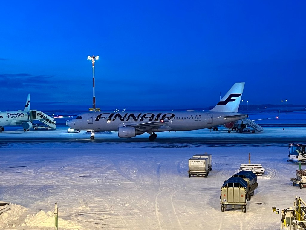 Perillä kentällä on mukavan ruuhkaista mutta ei ahdasta. Ikkunan takaa kiitoradalla rullaavat koneet ovat upea näky sinisessä alkuillan hämärässä.