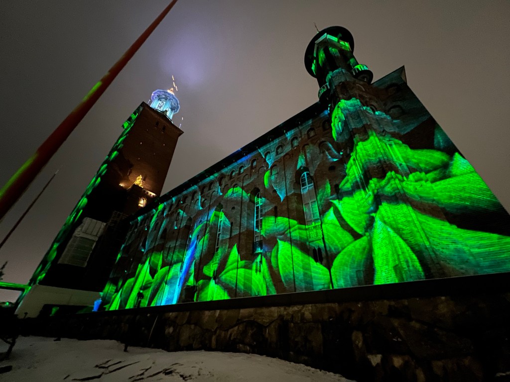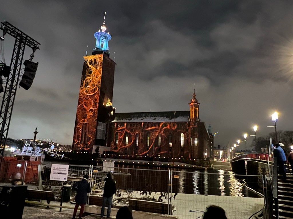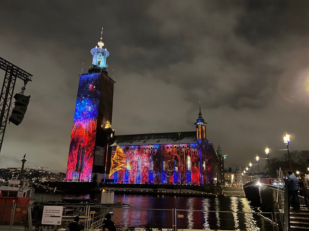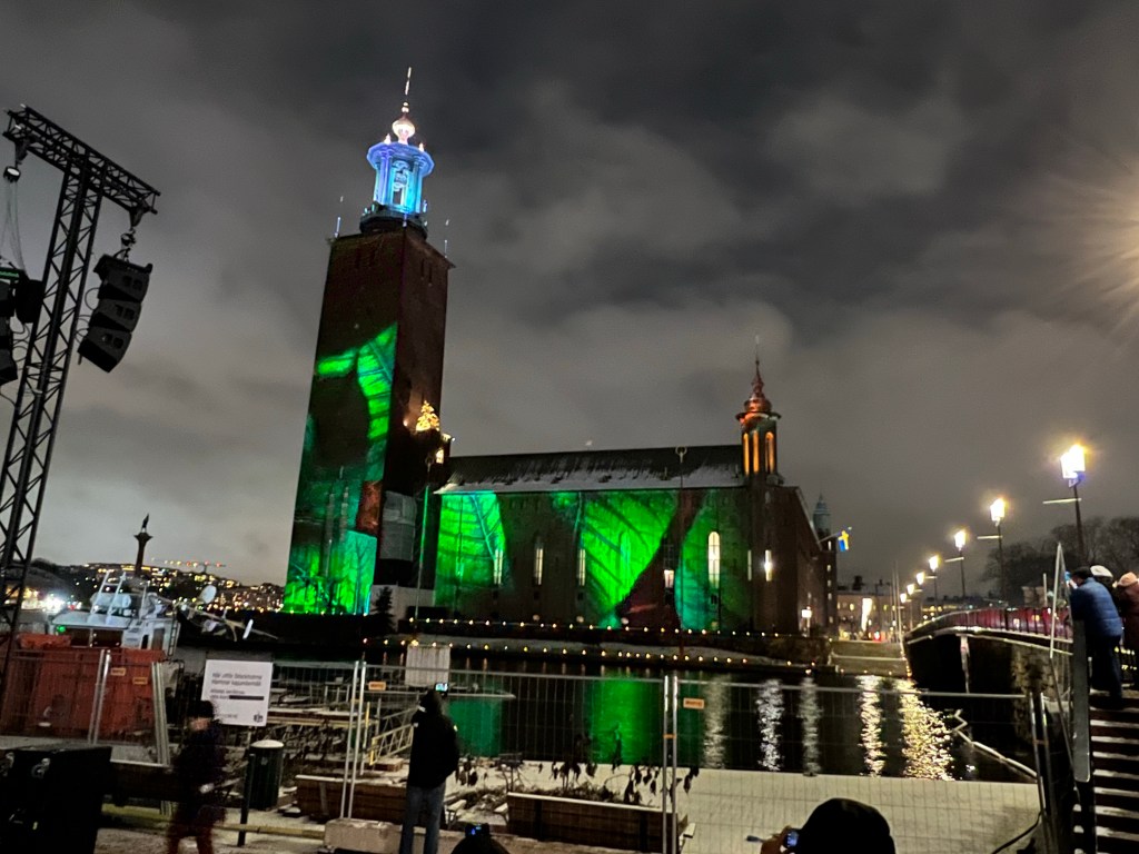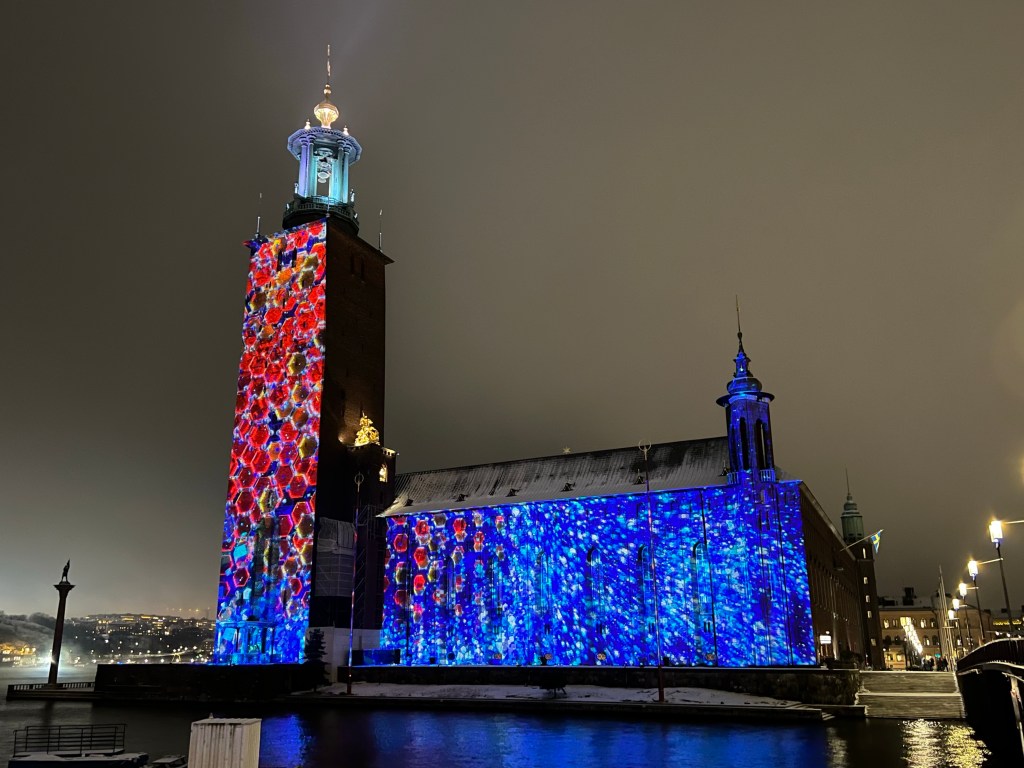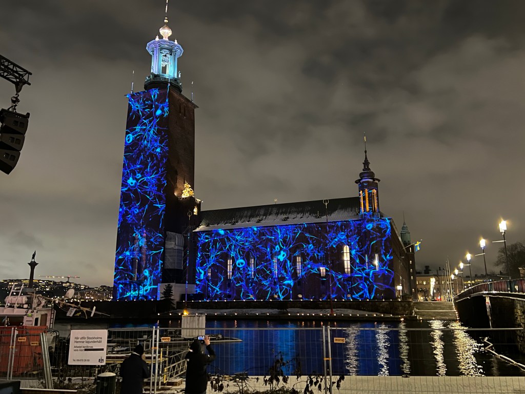 Kaupungintalon sseinälle oli loihdittu mitä upein valoteos Nobel-palkintokategorioiden teemalla. Upea ilta!