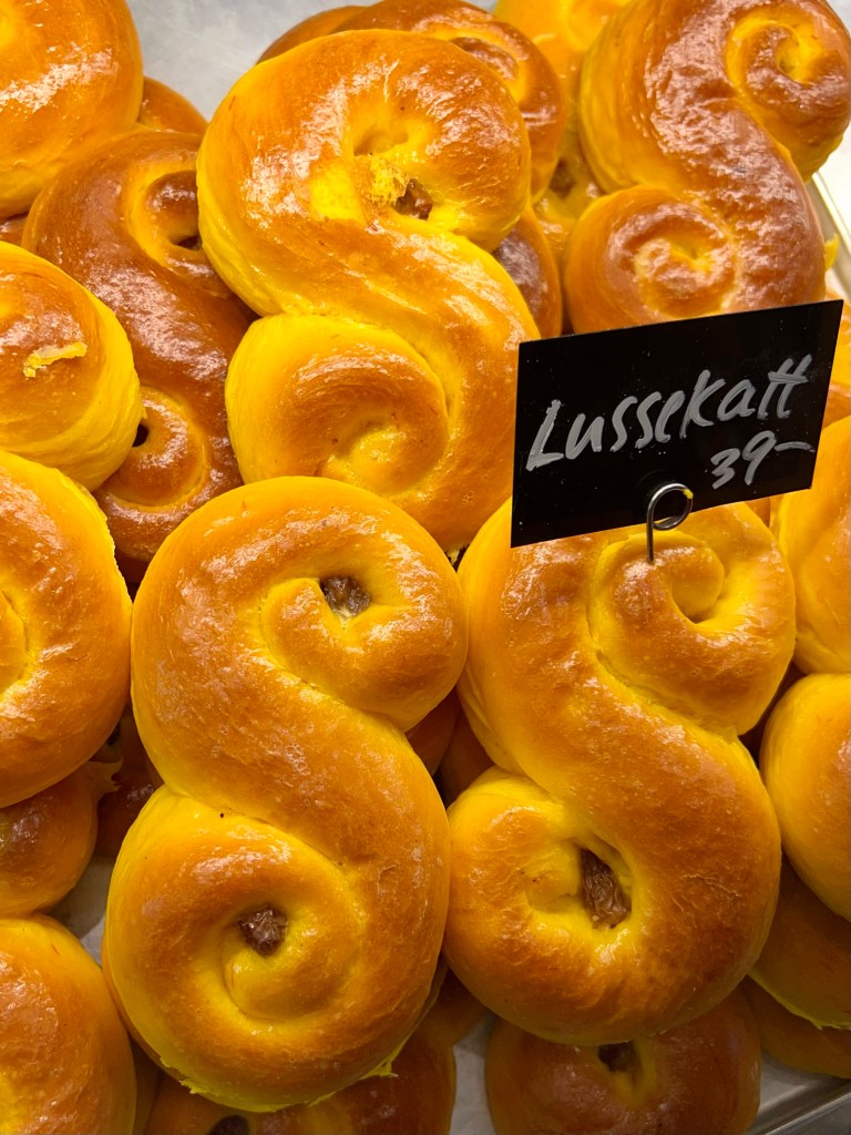 Viime viikonloppuna käytiin pikkujoulumatkalla Tukholmassa, jossa Lucian päivä otetaan selvästi vakavammin, ainakin kahviloissa ja leipomoissa. Luciapulla eli tuttavallisti lussekatt on s-kirjaimen muotoon leivottu pulla, joka tavallisista pullista yleensä eroaa värinsä puolesta: Luciapulla on keltainen, mikä johtuu taikinaan lisätystä sahramista. Se antaa myös pullalle hienostuneen maun.