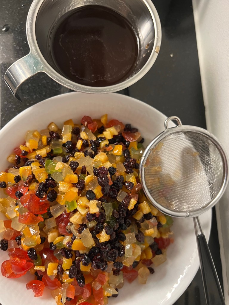 Kakun valmistus alkaa meillä varsinaista kakun tekoa edeltävänä päivänä. Aivan ensin nimittäin se tärkein eli hedelmäpalat saavat alkoholikylvyn. Helpointa on ollut laittaa hedelmät likoon edellisenä iltana, mutta lyhyemmälläkin ajalla pärjää.