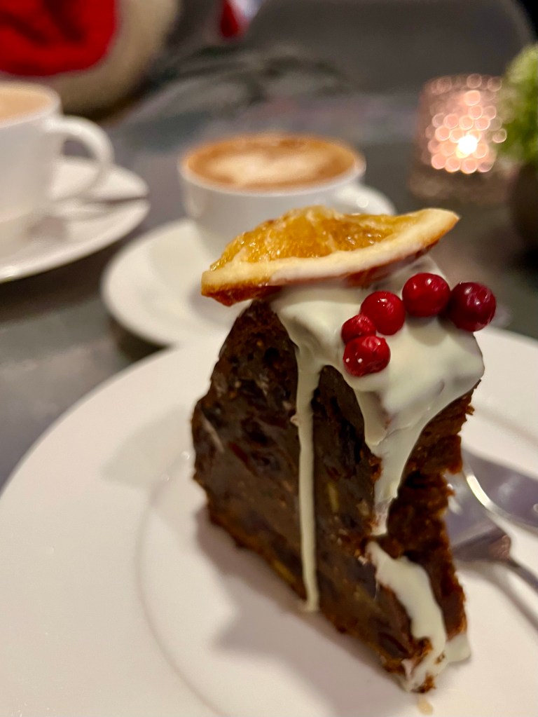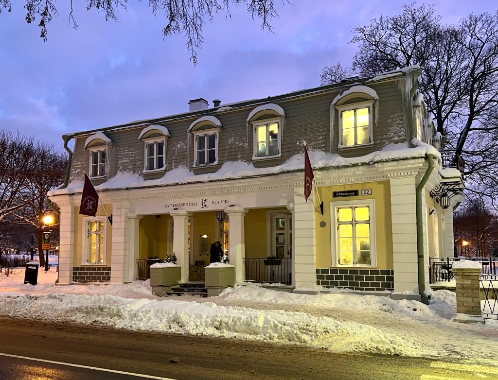 Museovisiitin jälkeen pysähdyttiin Kadriorgin puiston reunassa sijaitsevaan Katharinentalin kahvilaan, jossa edelliselläkin vierailulla poikettiin. Tällä kertaa kahvin kanssa maistui herkullinen inglise jõulukeeks eli englantilainen hedelmäkakku! Se suli suuhun.