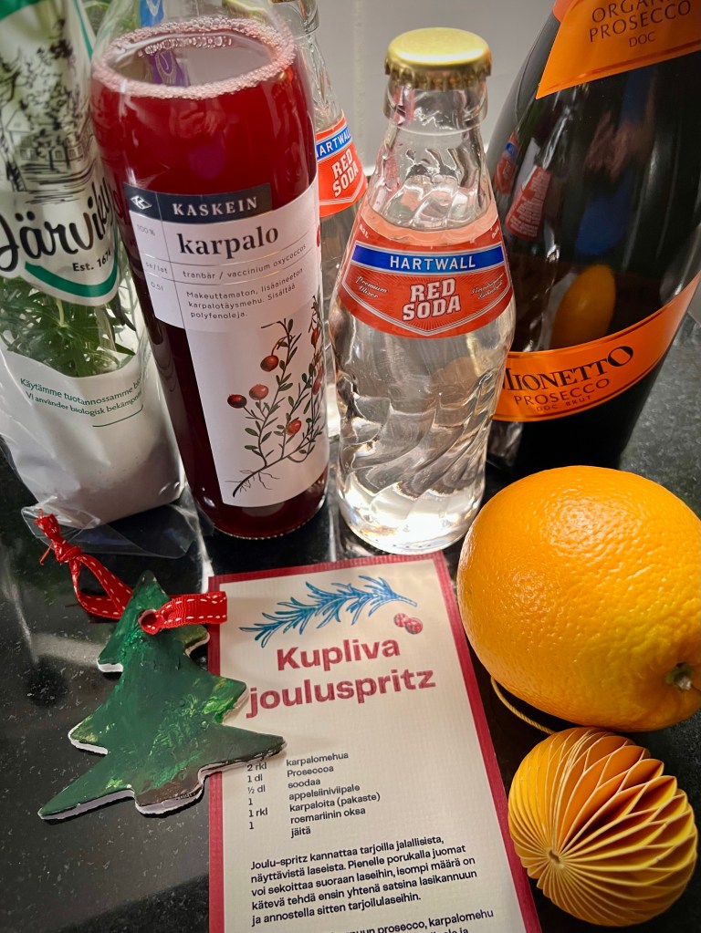 Kesistäkin tuttu spritz on nyt talvisessa tai jouluisessa makumaailmassa. Karpaloa ja appelsiinia. Tässä ainekset yhtä annosta kohti: