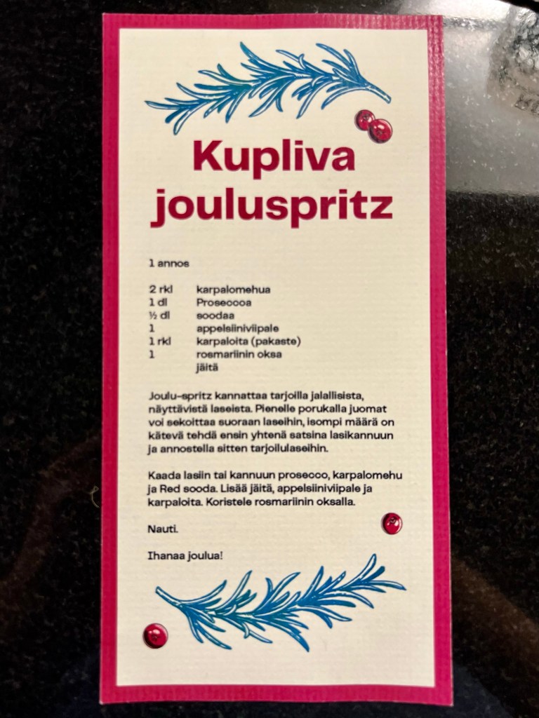 Kun kuulumiset oli vaihdettu ja lähdön aika oli, niin mukaan annettiin lahjakassi, joka sisälsi ainekset mukavaan jouluiseen juomaan. Ohjekin oli mukana!