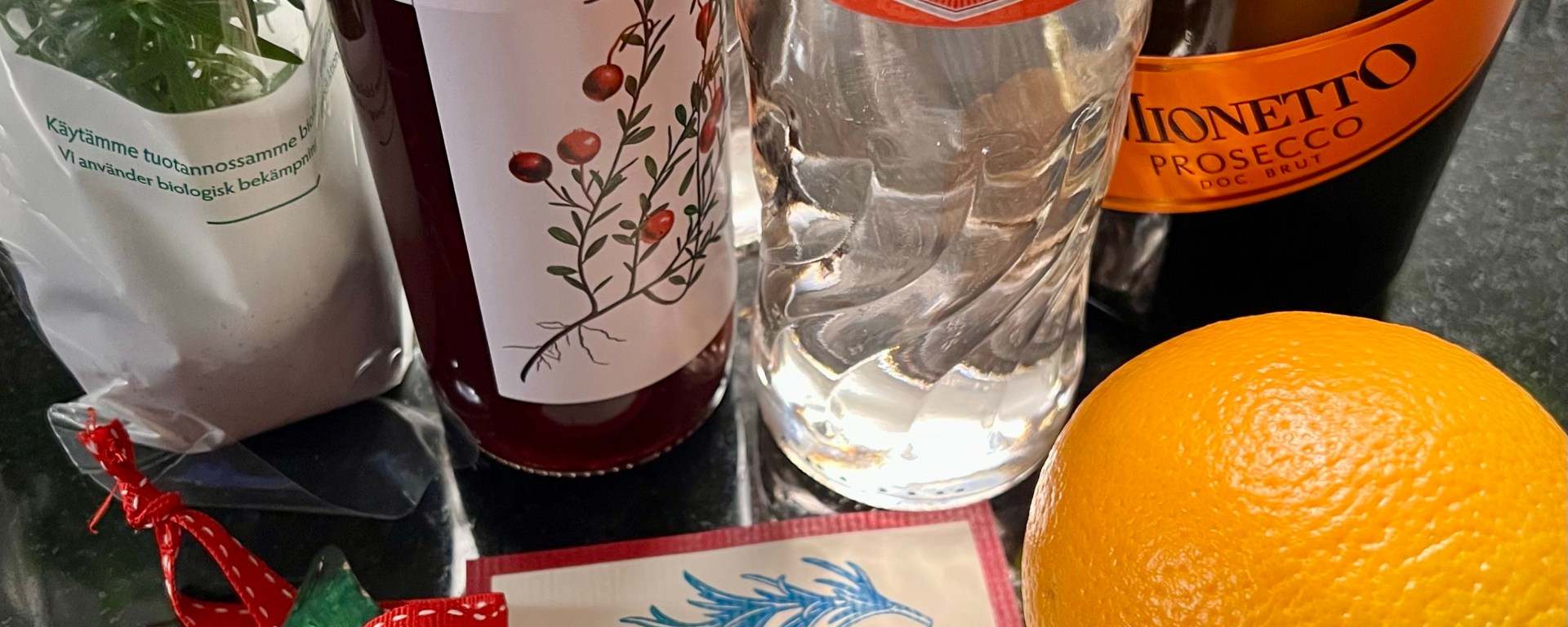 Kesistäkin tuttu spritz on nyt talvisessa tai jouluisessa makumaailmassa. Karpaloa ja appelsiinia. Tässä ainekset yhtä annosta kohti: