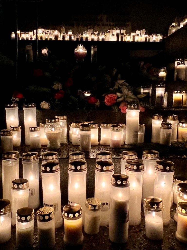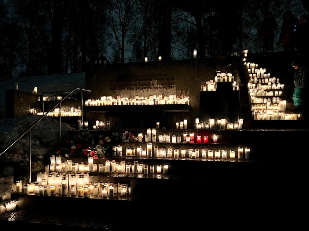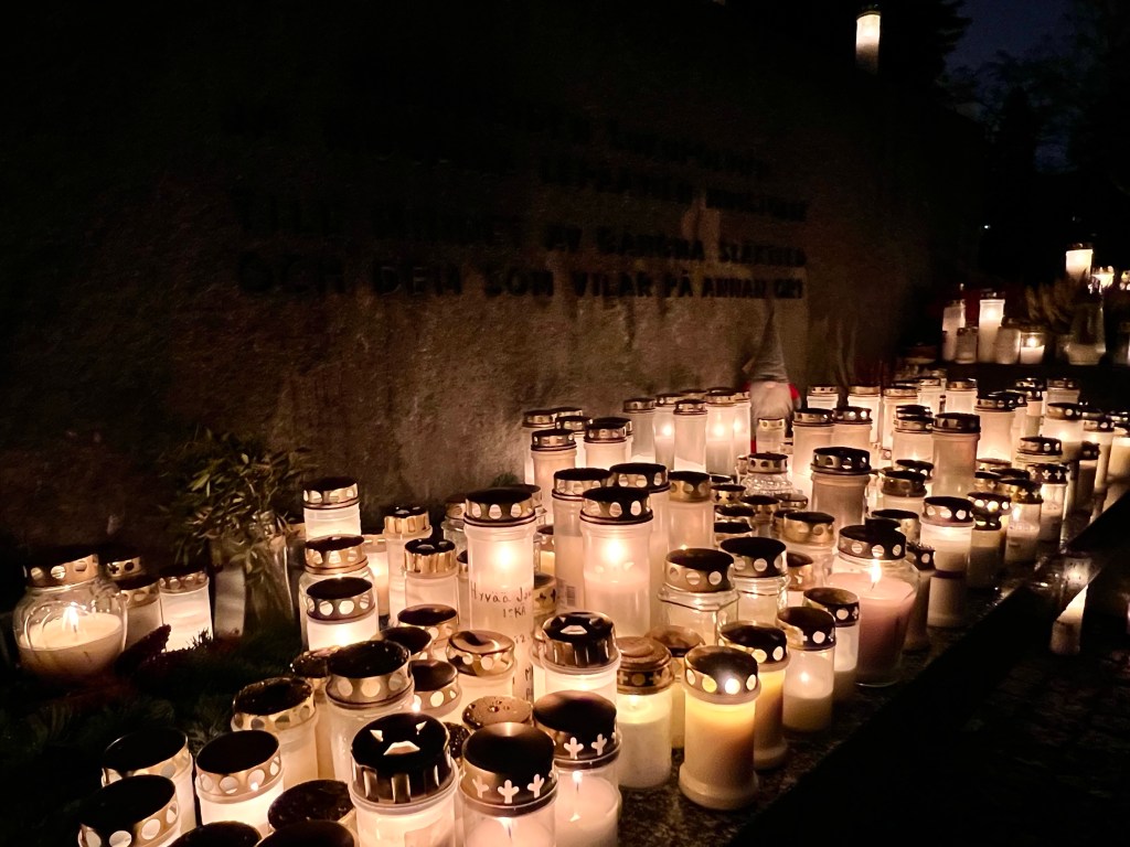 Yksi Helsingissä eniten vierailluista muualle haudattujen muistomerkeistä sijaitsee Hietaniemen hautausmaalla. Sinne tänäkin iltana veimme kynttilät tuomaan valoa pimeän keskellä.