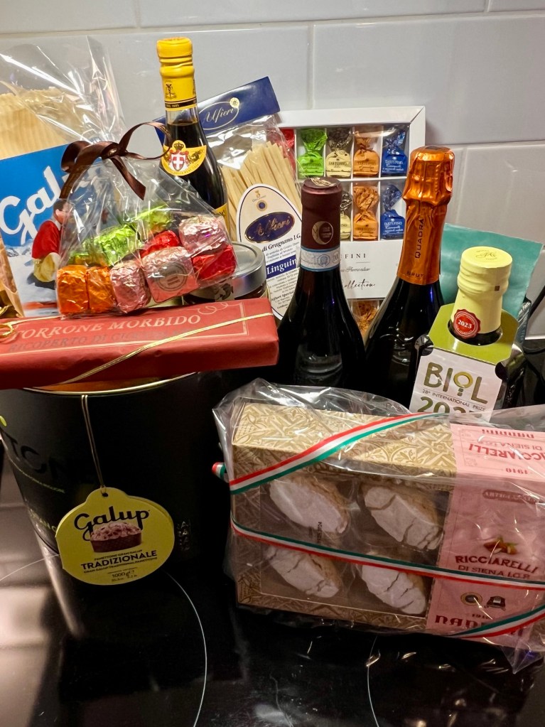 Mikä ihana yllätys, kun lähetti soittaa ovikelloa ja käsissään hänellä on iso pahvilaatikko täynnä herkkuja. Ja ei ihan mistä tahansa vaan melkein suoraan Italiasta.
