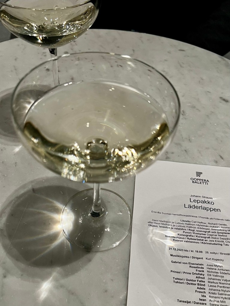 Väliajalla tietysti nautitaan lasillinen kuplivaa 😄 Ja jos Oopperaan menet, niin kannattaa väliaikatarjoilut ostaa ennakoon, niin välttää jonottamisen tarjoilujen odottaessa valmiina pöydässä.