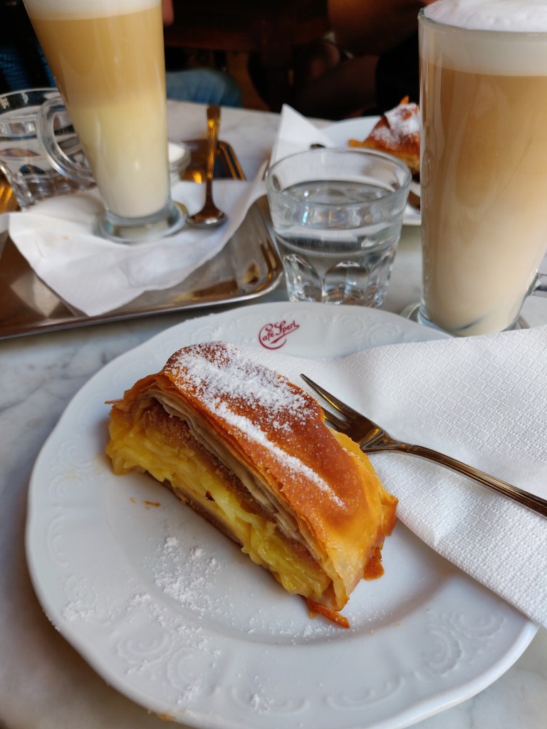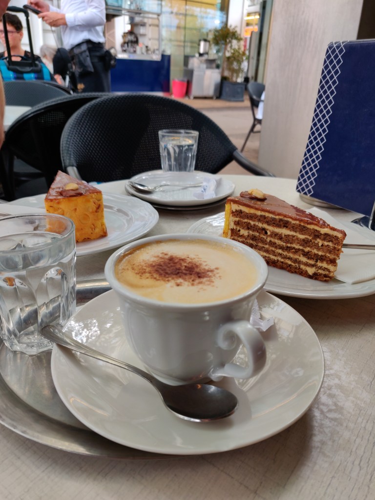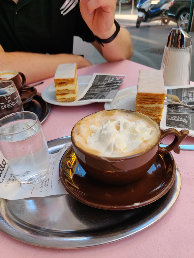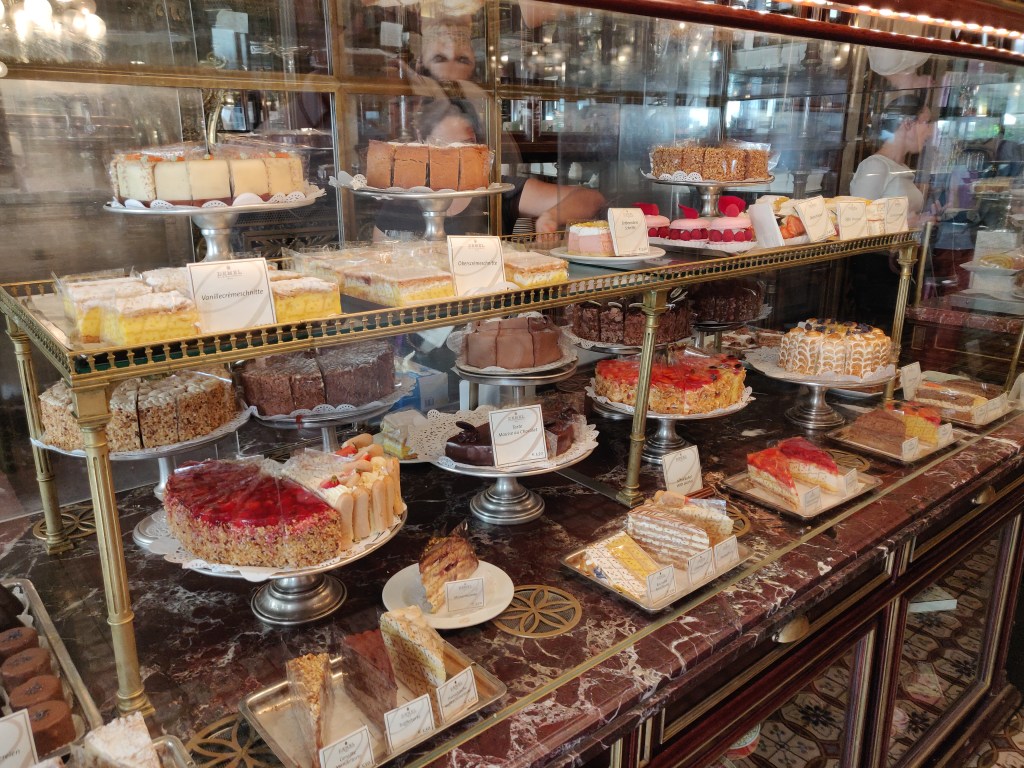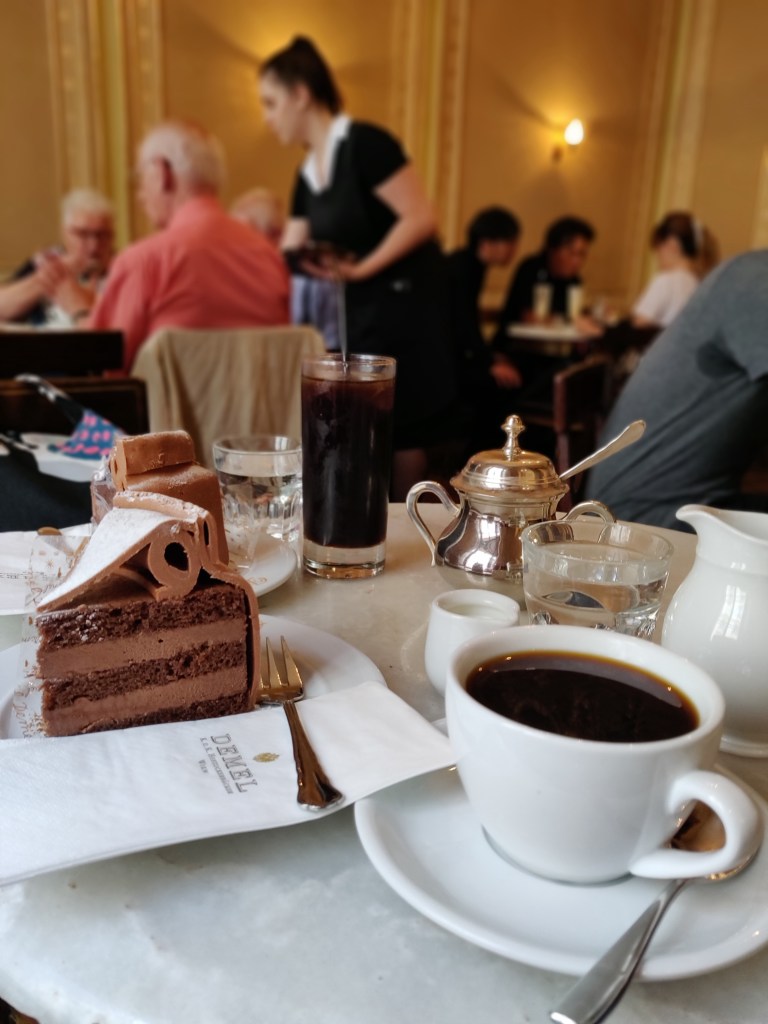 Ja kun jalkaa alkaa väsyttää ja askel painaa, niin suuntaa kahville. Kaupunki on tunnettu kahviloistaan, niitä on liki joka kulmalla ja monella on jo satavuotiset perinteet. Kun kesken kävelykierrosten alkaa väsy painaa, niin kahvilaan kannattaa poiketa. Perinteikkäimpien joukkoon kuuluvat mm. Café Sacher (se ”aito” kakkuresepti vuodelta 1832 ja kahvila Hotel Sacherissa vuodesta 1876) , Demel vuodesta 1786 sekä Café Sperl vuodesta 1880. Lisäksi löytyy mm. Aida-ketjun suositut kahvilat, jotka nekin jo toki toimineet vuodesta 1913. Ne tunnistaa vaaleanpunaisesta värimaailmastaan.