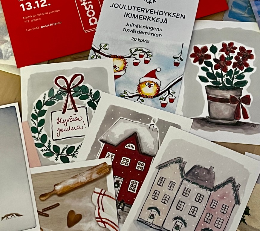 Postista joulukuun alussa poimittu punainen korttipussukka sanoo, että alemmalla taksalla kortit ehtivät vastaanottajalle jouluun mennessä, kun ne postittaa viimeistään 13. päivä. Aikaahan siis vielä on, mutta yleensä se takaraja tulee sitten yllättävän nopeasti vastaan. Tänään siis kirjoittamaan ne muutamat kortit, jotka vielä meiltä ystäville ja sukulaisille lähtevät. Saatujen korttien määrä vähenee vuosi vuodelta, mutta ne jotka muistavat kortilla, tulevat kyllä muistettua kauan! Jatka artikkeliin Kalenterin luukku 7: joulukortit
